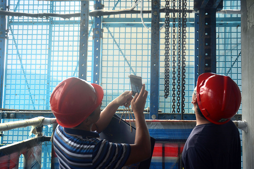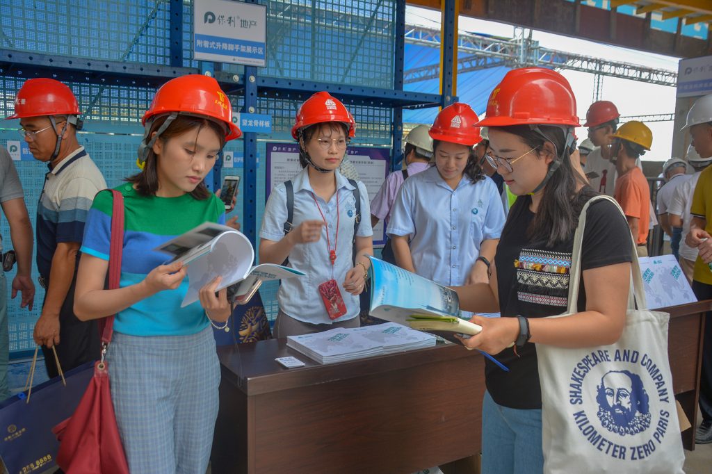 隨行的觀(guān)摩團(tuán)對(duì)達(dá)蒙的DM300爬架產(chǎn)生了濃厚興趣,為了更深入了解達(dá)蒙爬架,觀(guān)摩團(tuán)跟隨我們上樓層現(xiàn)場(chǎng)觀(guān)摩,并踴躍進(jìn)行提問(wèn)與交流。